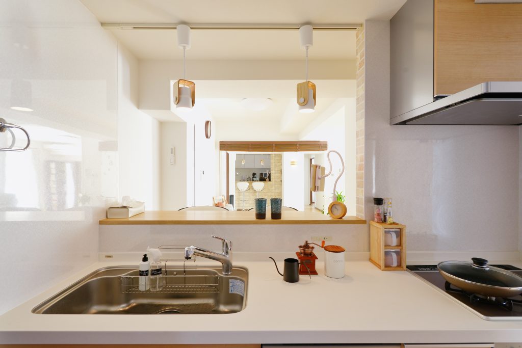・キッチンは回遊できる動線と手前のちょっとしたカウンターで朝の家事動線がコンパクトに