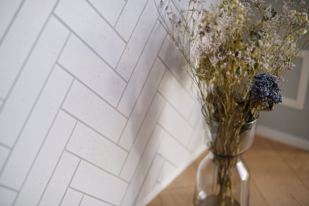 デザイン面:キッチンカウンター下のヘリンボーン貼りしたタイル