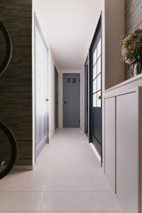 プラン面:隣り合う居室の空間を狭め、玄関を広くとり、ロードバイクを置けるスペースを確保しました