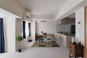 空間を広く見せる工夫:ひとつひとつが閉鎖的だった空間は、間仕切り壁を取り除いたり、商品を工夫することでつながり感を大切にできる家としました。