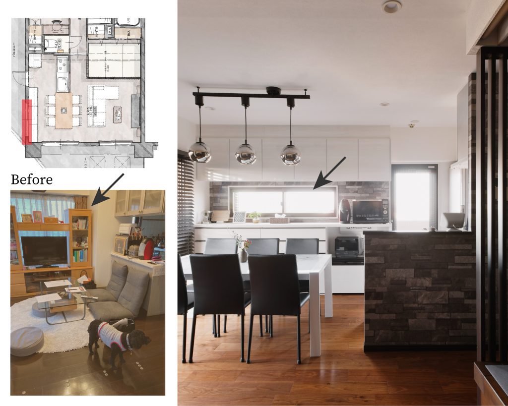 既存の掃き出しサッシを腰高窓サイズに小さくすることで、大きなカップボードを設けました。限られた空間の有効活用の工夫です。