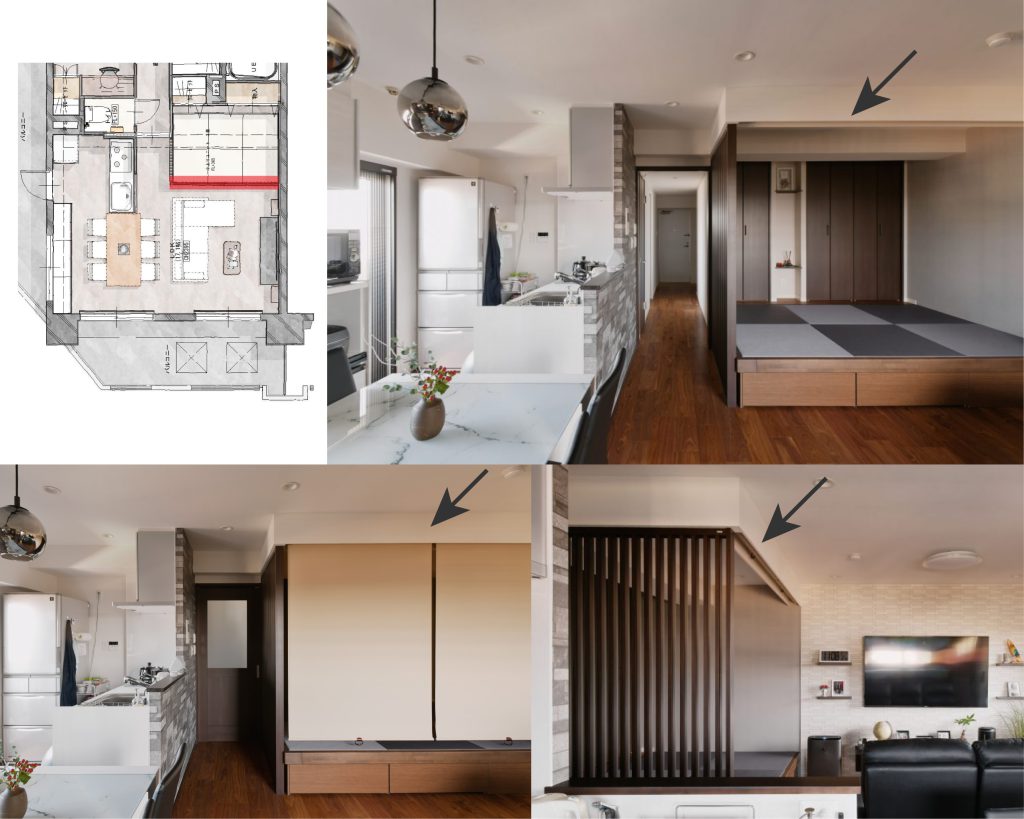 限られた空間の中で、収納とお子様が寝泊まりできる空間を確保しつつさらに水まわりのゆとりを確保していくように工夫をいたしました。キッチンの背面のカップボード収納は掃き出し窓があった場所を内側に壁を作り内窓を入れることで、腰高窓にして大きなカップボード収納を設置いたしました。お仕事部屋の寝室はシンプルで機能的に、LDKはスリット格子や収納にもなる畳が丘、ニッチ収納でダークで和モダンな素敵空間に仕上げました。