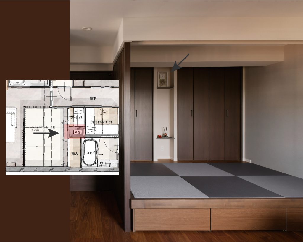 ゲストが泊まれるように作った畳の小上がり空間にはクローゼットを設けました。クローゼットを間口いっぱいに作りたかったけれど、配管スペース(PS)が背面にあるので断念。しかし、ニッチとしてスペースを確保して、アクセントになるように設計しております。
