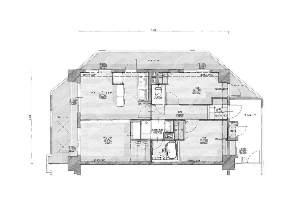 寝室、廊下、キッチン、浴室、トイレ、洗面、リビング、ダイニング