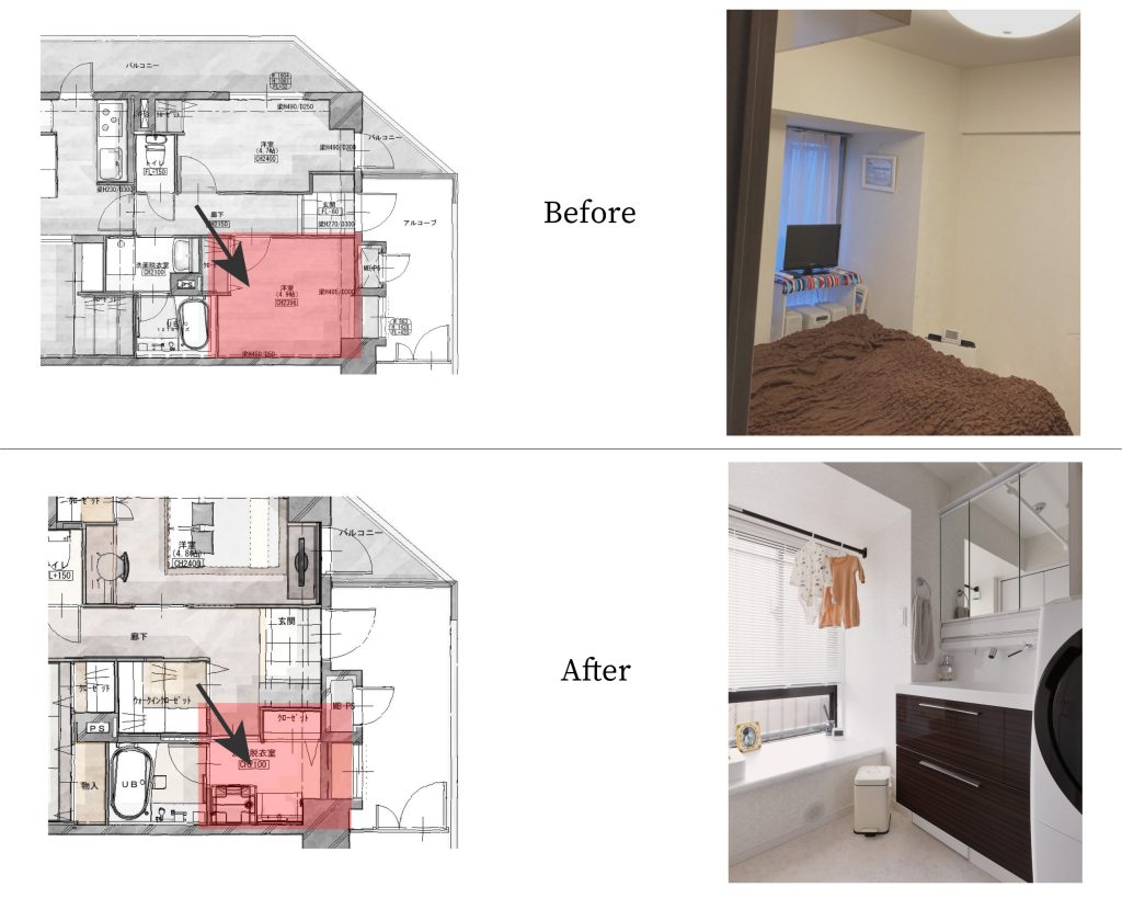 洗面室の位置はガラっと変わり、入り口横の元洋室へ移設しました。出窓部分はハンガーパイプを設けることで、洗濯物をかけることができるように工夫をしています。奥行のある出窓のカウンターは小物を飾ることもできます。