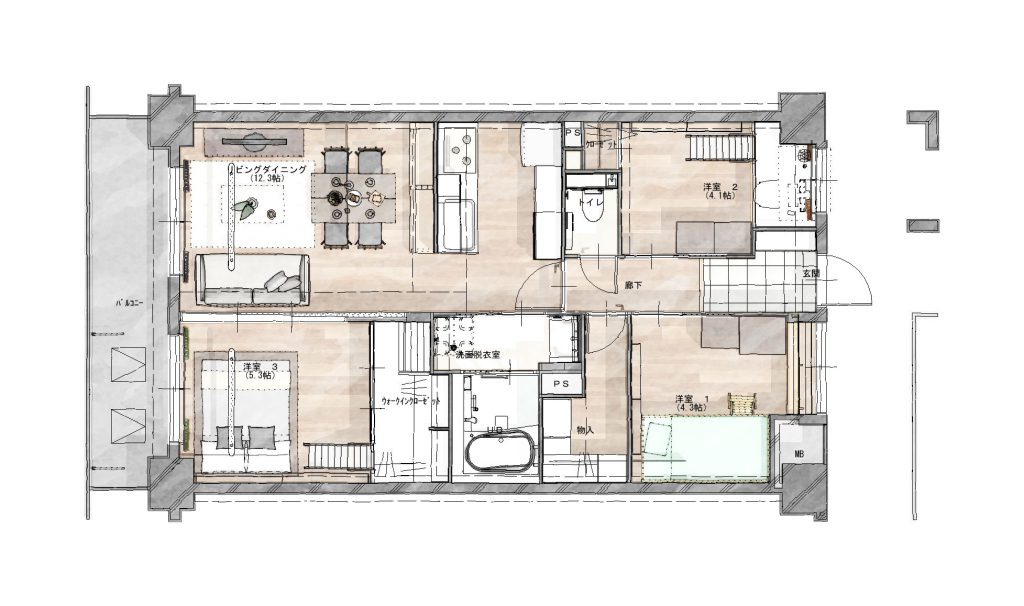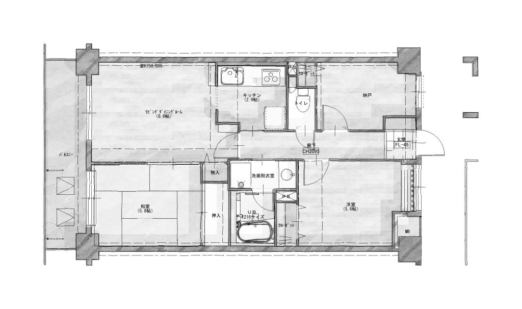 廊下、キッチン、浴室、トイレ、洗面、リビング、ダイニング、寝室