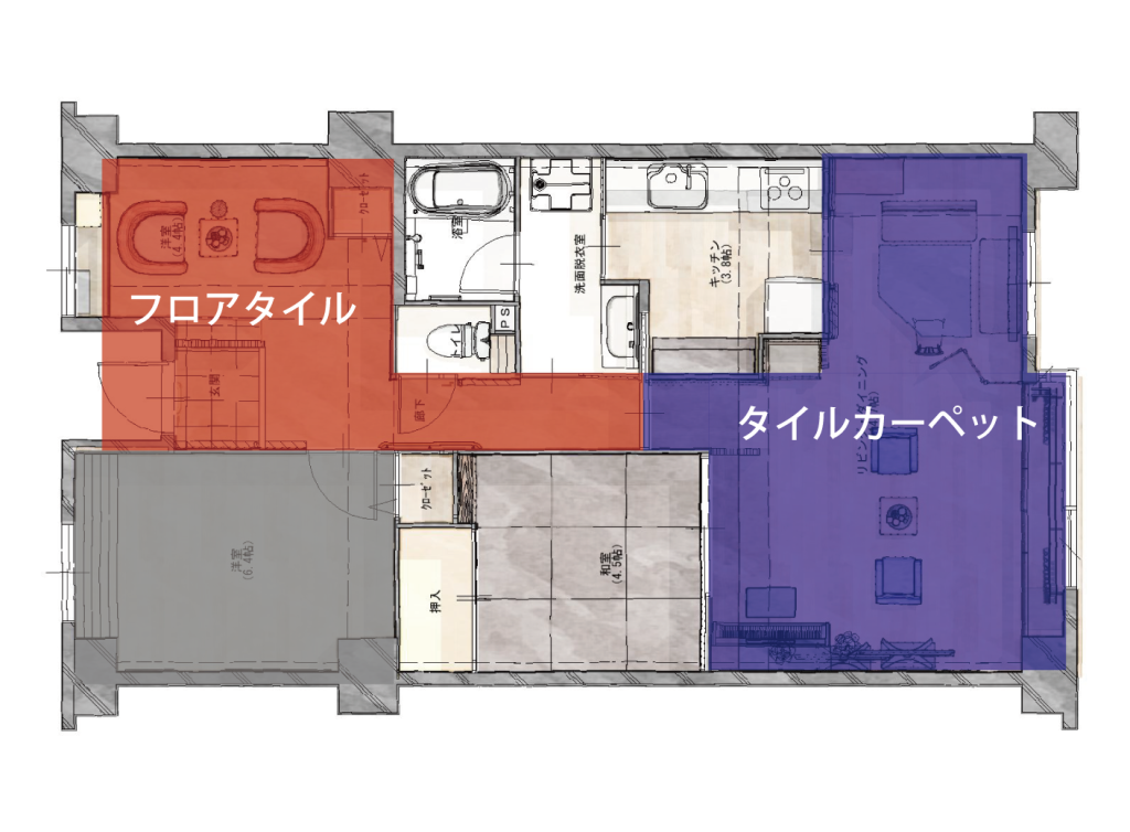 リビングダイニングは膝をついても柔らかいタイルカーペットを敷きました。フロアタイルは硬いため、場所によって使い分けています。
