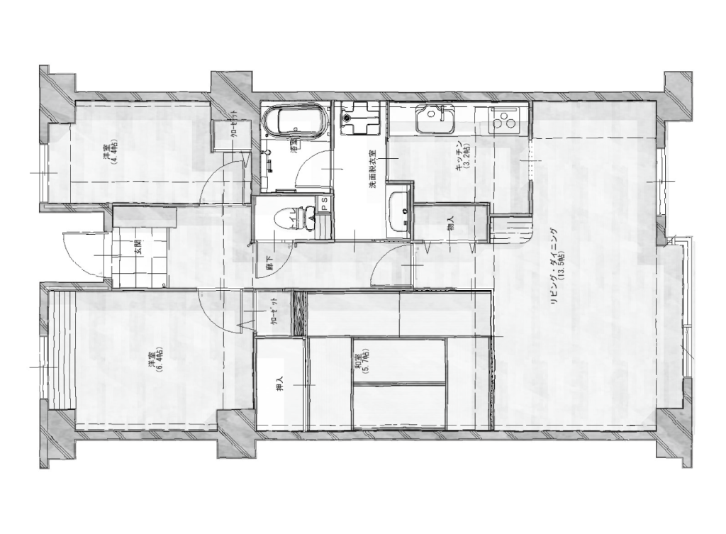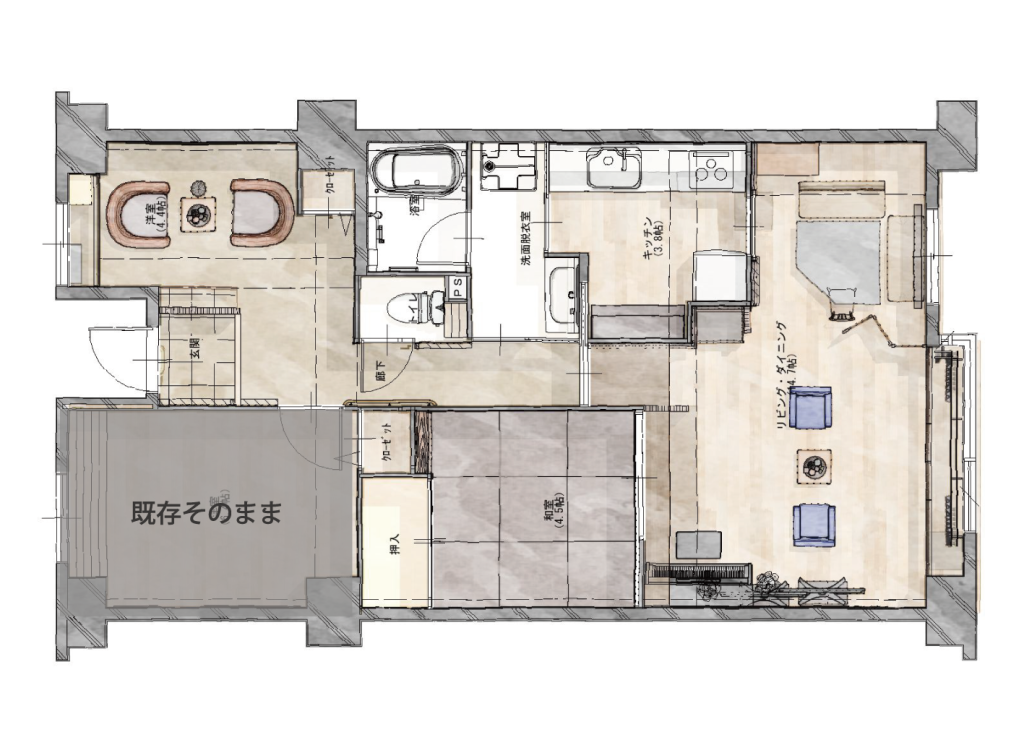 最初は玄関横の洋室空間を壁を抜いて広くし、来客対応スペースを作るのみのご相談でした