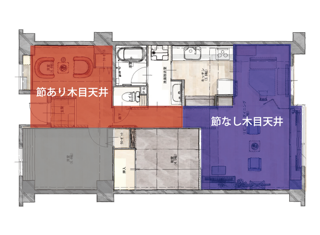天井の木目のクロスも2種類で使い分けています。