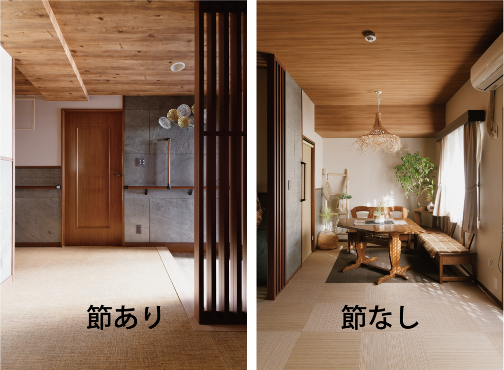 当初、すべて節ありのクロスで予定をしていましたが、リビングダイニングの空間はすっきりとした印象にするために節なしのクロスへと変更しました。