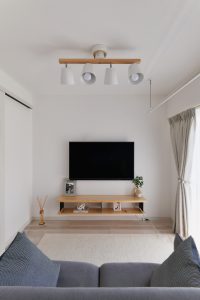 ダウンライトは天井裏にある程度のスペースが無いと取り付けることができません。Y様邸はコンクリート直の天井だったため、大工さんに天井を組んでもらい電源を廻すスペースを作りました。下がった天井は木目のクロスを貼ることでアクセントにしています。