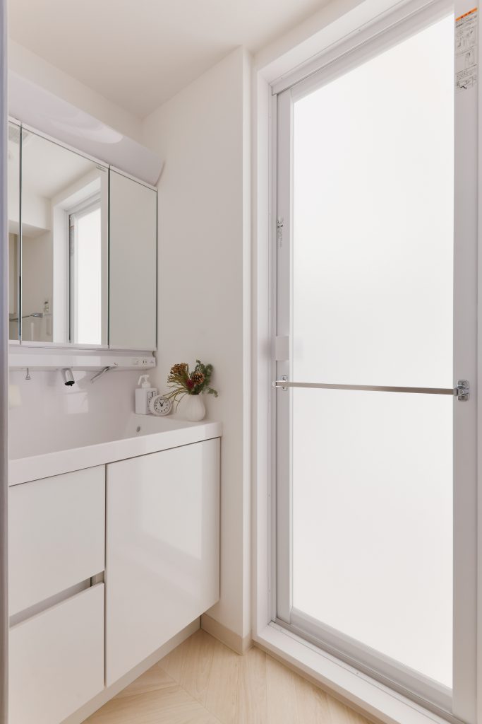 ユニットバス入口側の壁をあえて厚く作ることで、すき間を無くし、すっきりと仕上げています。