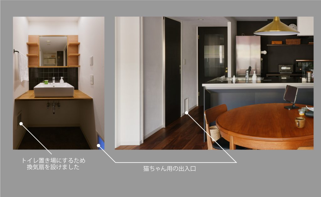 トイレ置き場もあらかじめ想定しており、換気扇を完備。猫ちゃんがリビングからトイレにスムーズにアクセスできるように小窓も設けています。