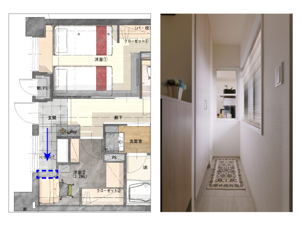 玄関土間に設けた収納スペースから明かりが書斎に入るように、室内窓を設けて圧迫感を軽減しています。