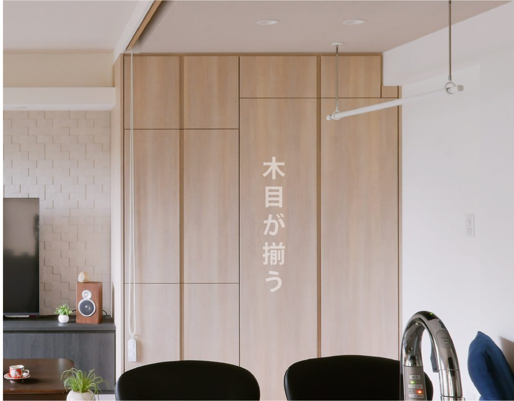 一番目に入る場所だからこそ、表面の仕上げにこだわりました。表面の面材の木目が続くように、大判の面材を割いて造作しています。