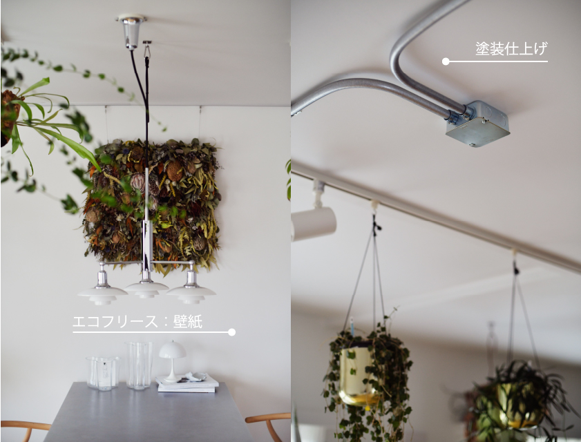 リビングダイニングの天井は塗装仕上げになっていますが、壁はぬりかべに近い質感のエコフリースを採用しています。天井と壁の質感の差がわからなくなるほど上質な壁紙です。