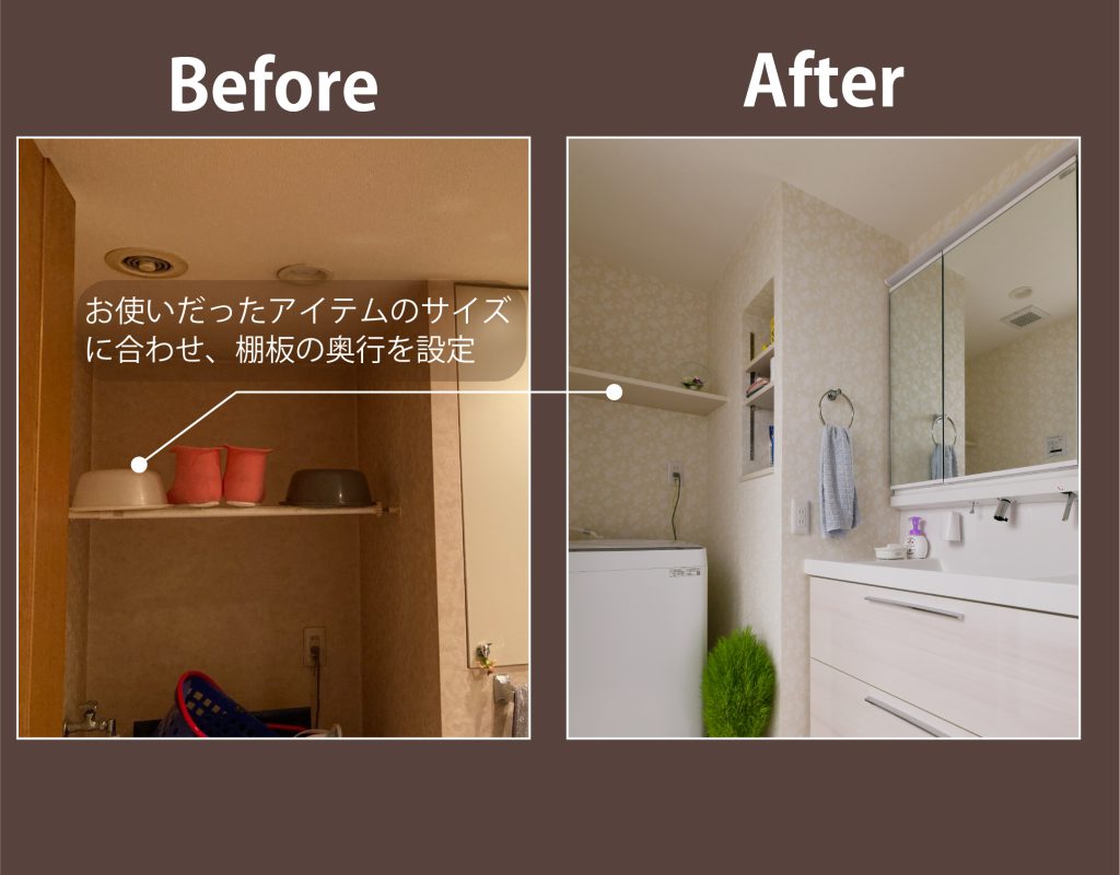 置くもの、使うモノが明確な場合は、壁や棚の位置を合わせて造ることができるのもリフォームの醍醐味です。