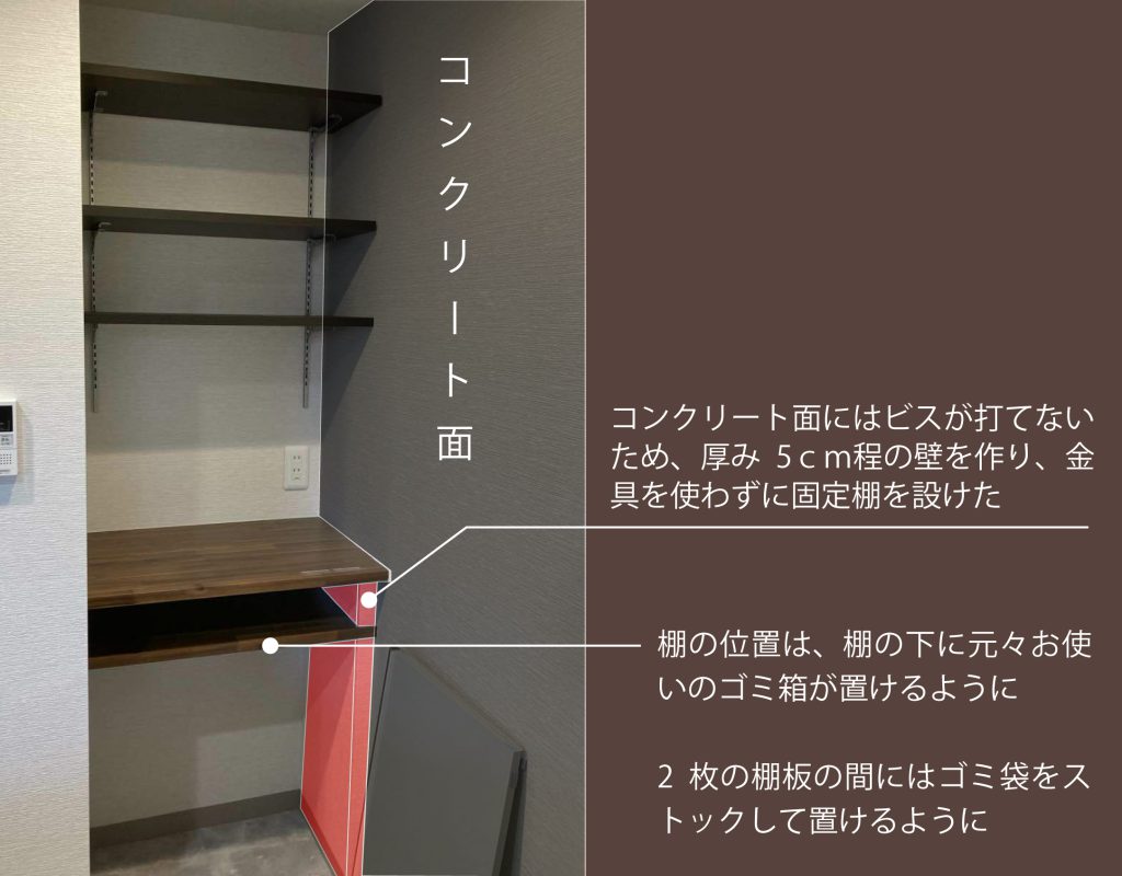 側面が躯体面(コンクリート)だったこともあり棚板を据え付けるために工夫を凝らしました。