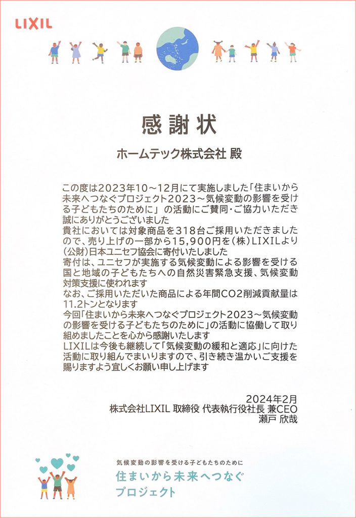 このたびLIXIL様より、同社の「住まいから未来へつなぐプロジェクト2023~気候変動の影響を受ける子供たちのために」の活動への賛同・協力に対する感謝状をいただきました。