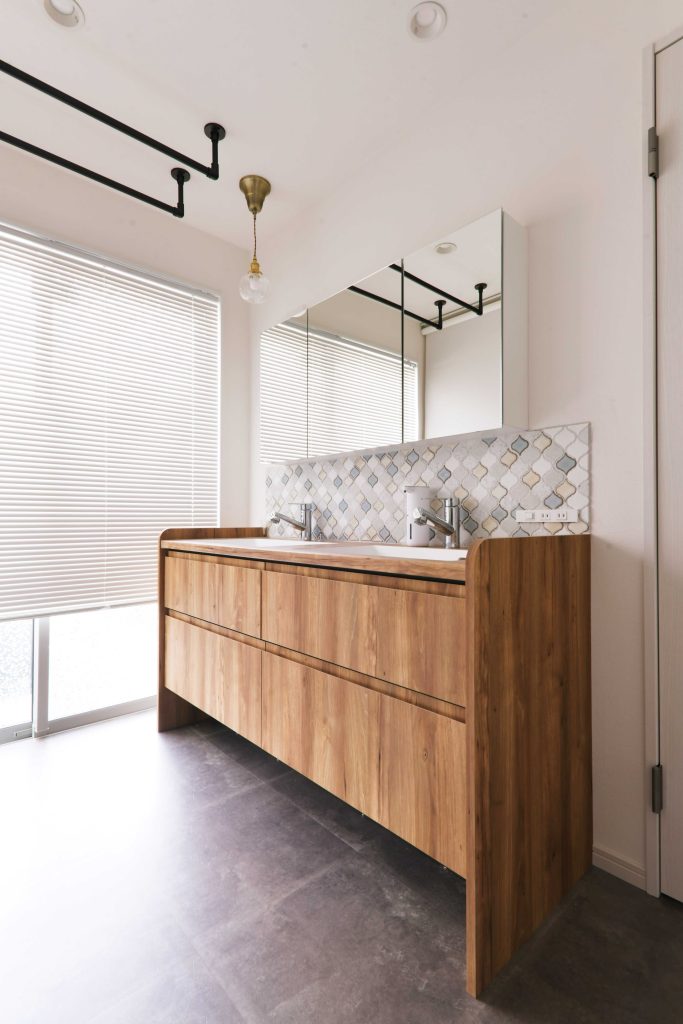 元々洗面室と脱衣室が繋がっている空間を2つに分け、ご来客があった際も脱衣側は隠せるように間取りを変更しました。見せる洗面台として普段は開けっ放しにしておいてもOKなステキな洗面室に。鏡と洗面台の間のタイルはお客様にご選定頂いた商品。センスが光ります。