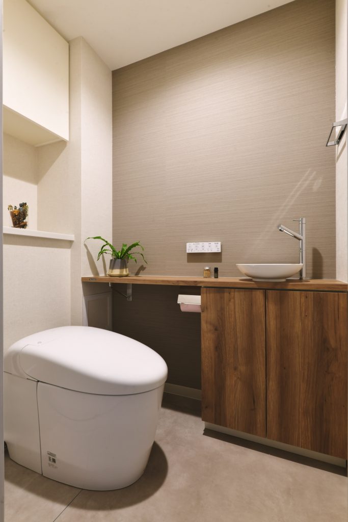 収納はシンプルに。グレーのアクセントクロスや木目の天井クロスで意匠性のあるトイレ空間に。