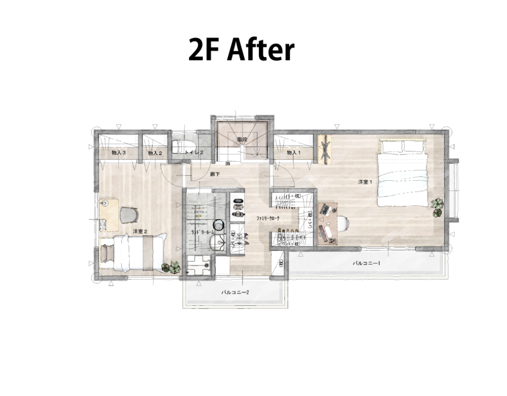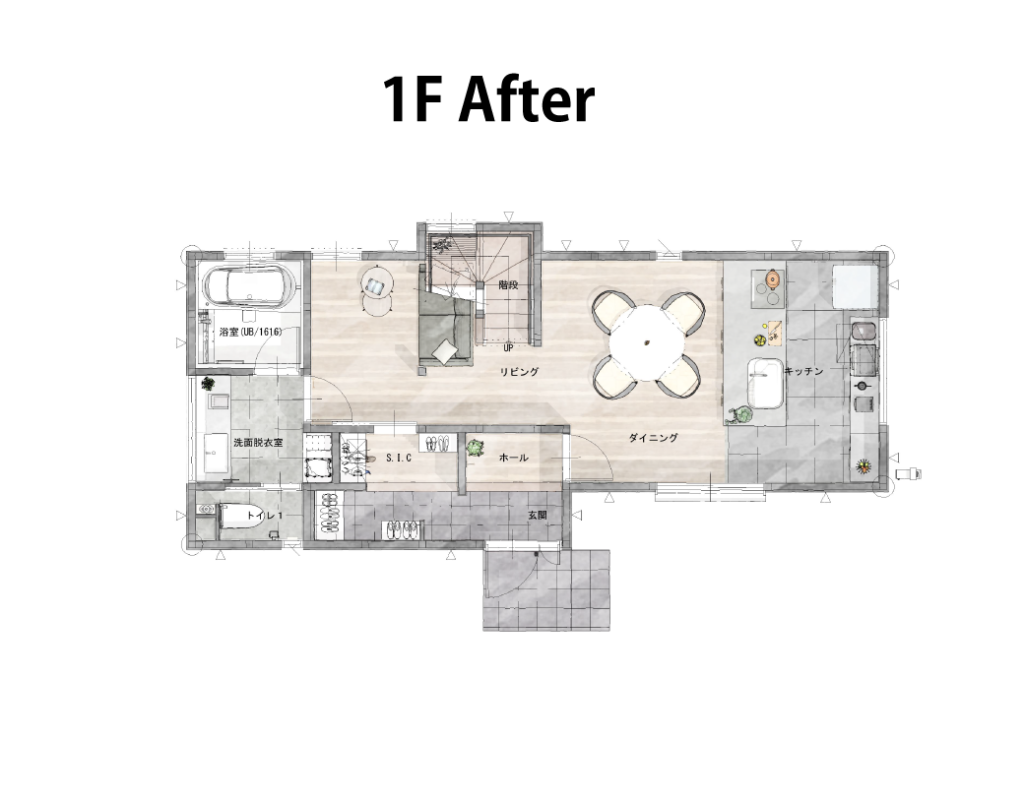 解決策: 洗濯機能を2階に移設し、約1畳のランドリー専用室を新設。スロップシンク(深型洗い場)も設置して、靴洗いなどの雑用にも対応。