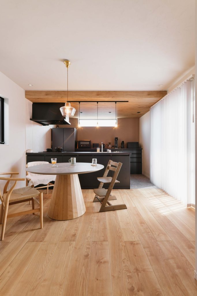 ポイント: パブリックスペースとプライベートスペースを明確に分けることで、おもてなし空間と実用空間を両立。