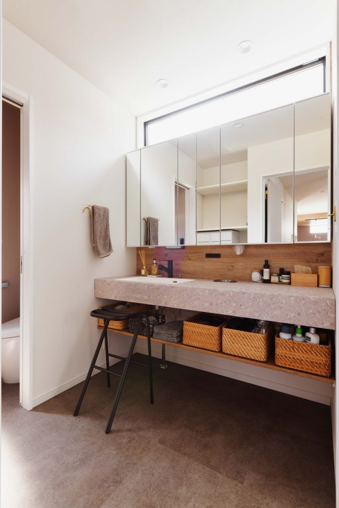 洗面室はゲストも使うところ。ランドリールームを2Fへ独立させたことで、1Fはおしゃれをキープしてスッキリと暮らすことができるようになったのが大きなポイントです。