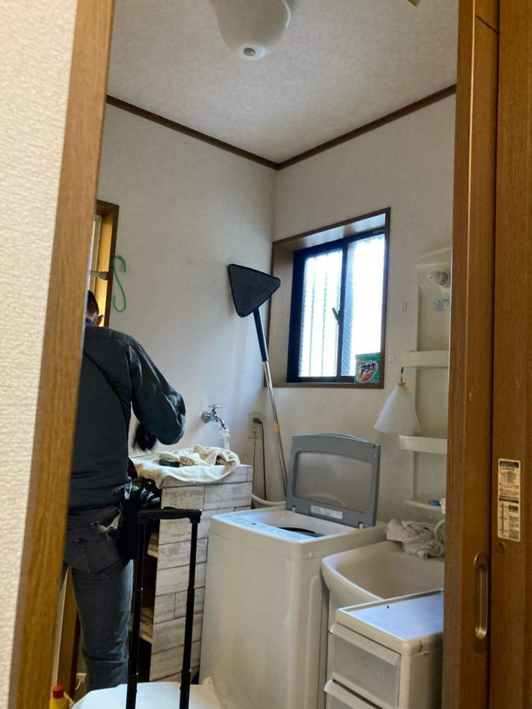 解決策: 玄関→ウォークインクローゼット→洗面室→浴室を回遊できる動線にリノベーション。基本は浴室乾燥を活用し、洗面空間には一時掛け用のハンギングバーを設置。
