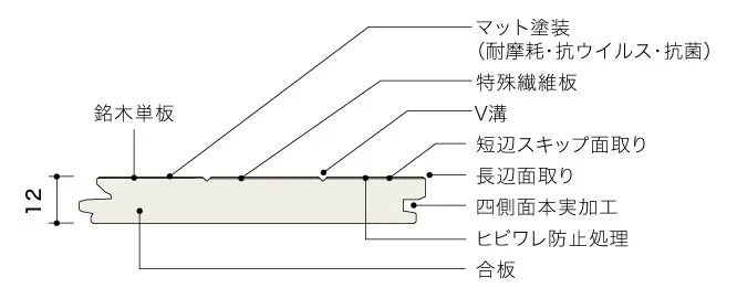 突き板フローリングは、0.2〜0.6mm程度の天然木をスライスし、合板に貼り合わせたもの。天然木の“表情”を楽しみながら、コストを抑えられるのが魅力です。