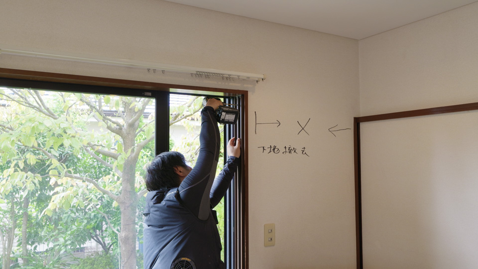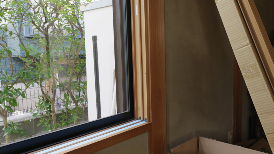 既存窓の確認と枠材の取り付け