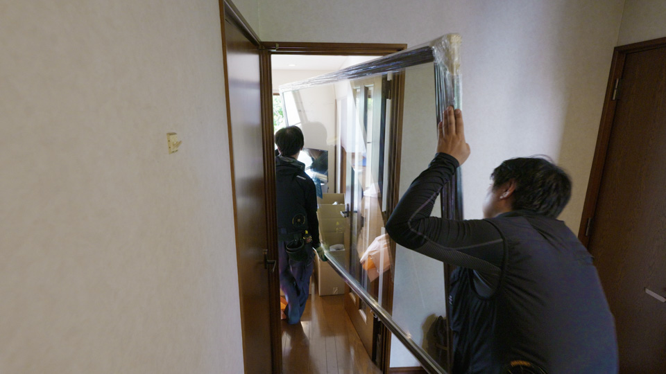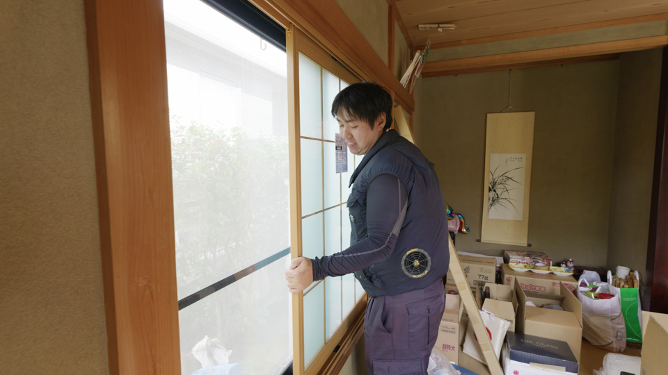 採寸に合わせて製作されたサッシとガラスを取り付けます。襖と同じ要領で、上からはめて、レールに載せます