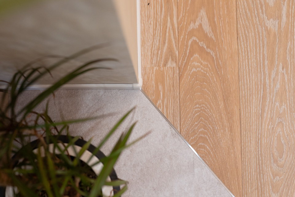 無垢フローリングやナチュラルテイストの空間には、特製の木製の見切り材を入れることも。