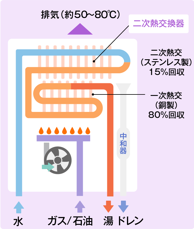 従来のガス給湯器は、約80%の熱を効率よくお湯に変えていましたが、残りの約20%の熱は、高温のまま排気として外に捨てられていました。