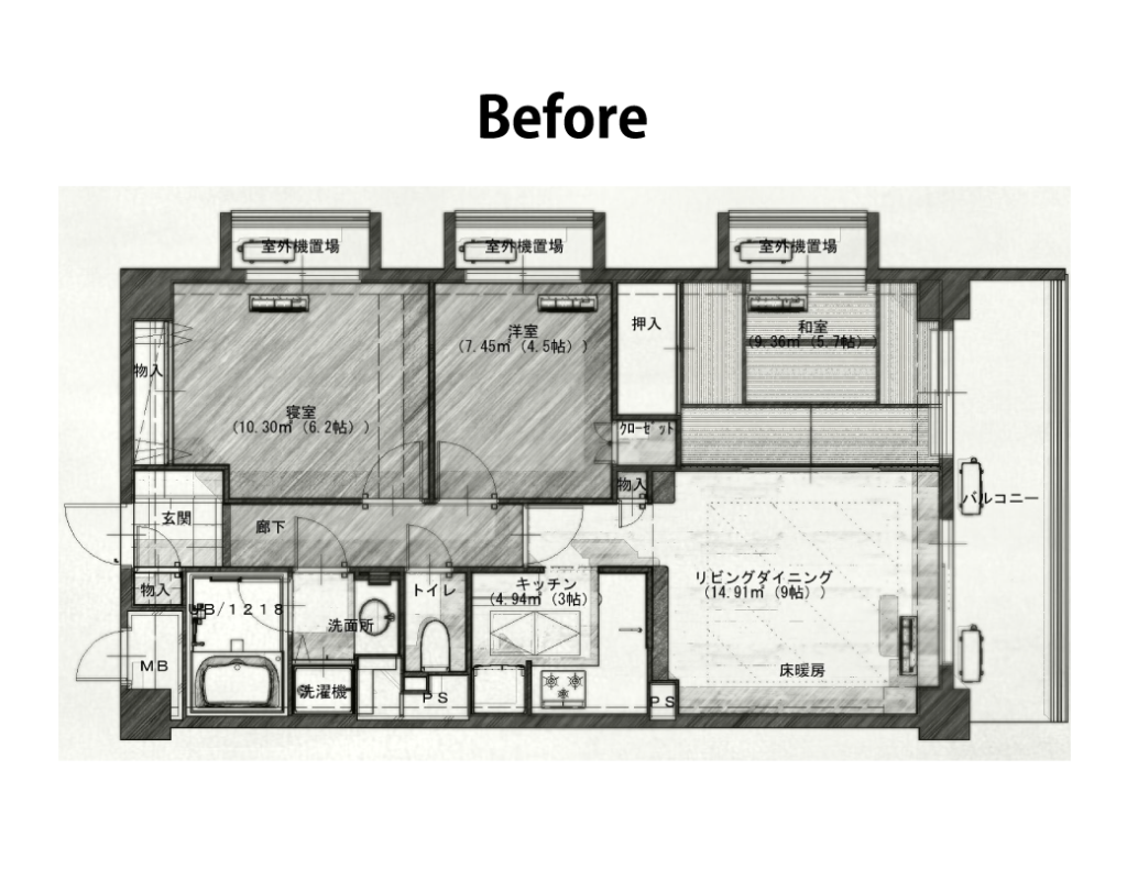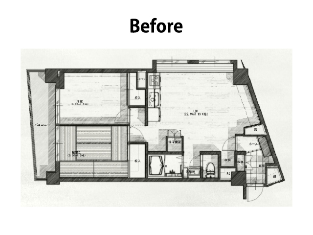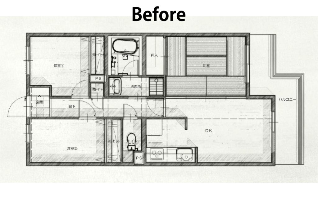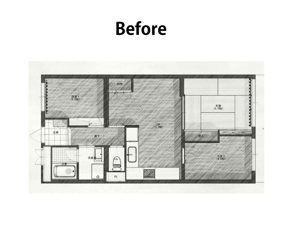 子供が産まれ、家族4人で快適に暮らすためのリノベーション。ご夫婦のご要望は夫婦それぞれのスペースや収納を確保したいというものでした。