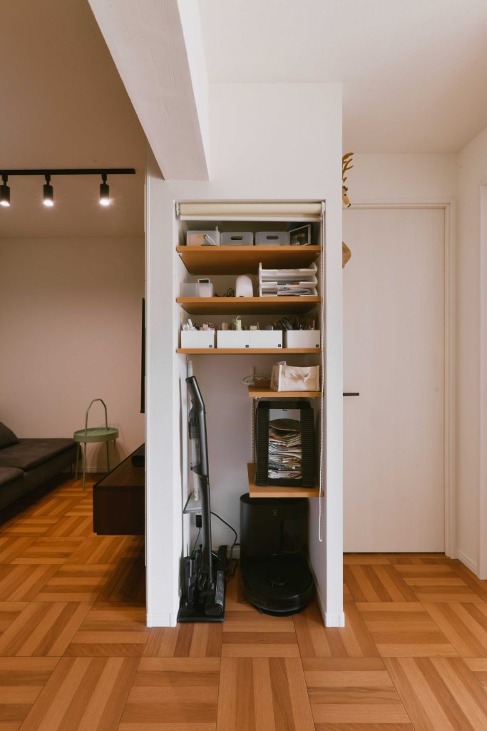 リビングの一部は飾り棚で見せ、日用品は扉付き収納へ。視覚的なスッキリ感が重要。