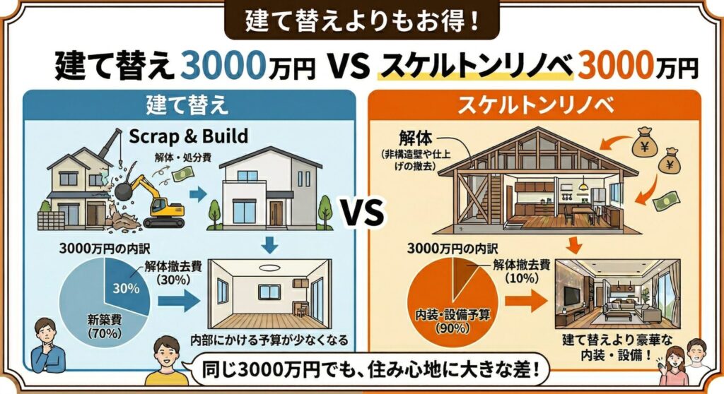 「希望通りの家にするなら、いっそ新築や建て替えの方がいいのでは?」と思うかもしれません。しかし、基礎や骨組みを再利用するスケルトンリフォームは、建物を更地にして一から建て直すよりも、大幅にコストを抑えることができます。