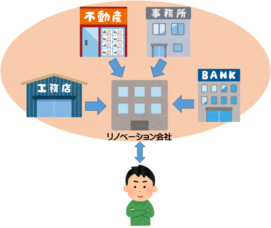 中古物件探しから施工まで、すべての工程を完全に一社が担うワンストップリノベーションの方法です。