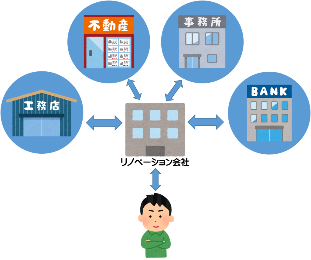 基本的に設計会社が窓口となり、不動産や施工は提携会社が行うワンストップリノベーションの方法です。