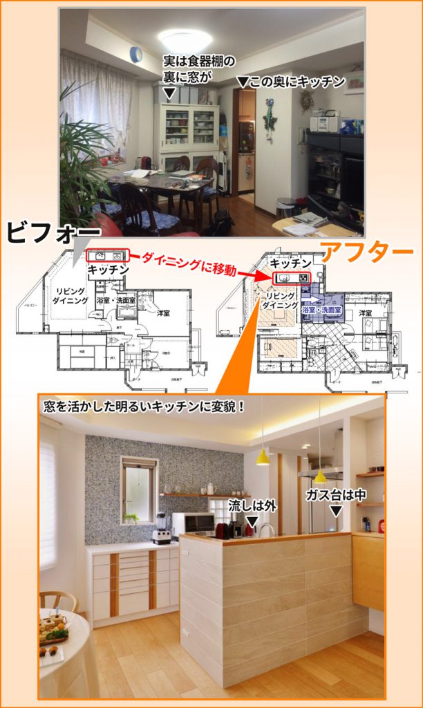 壁を向いていたキッチンをダイニングに向け、流し台だけ外に出しています。