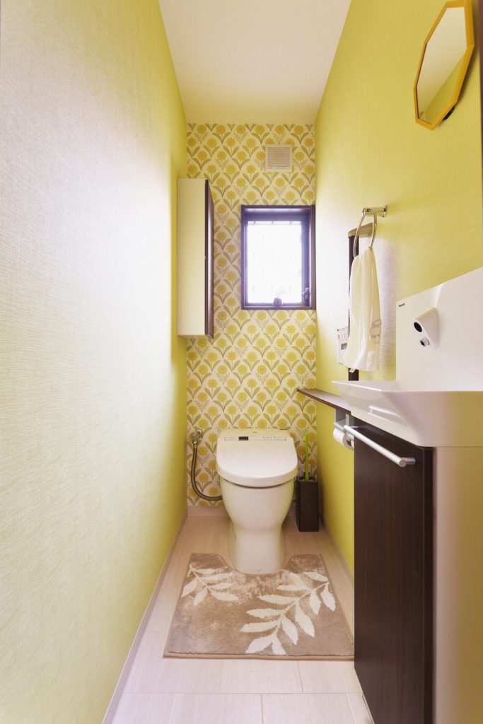 トイレのアクセントクロスは風水でお選びになりました。奥様のご趣味の観葉植物ともよく合う色で、非常に満足していらっしゃいました