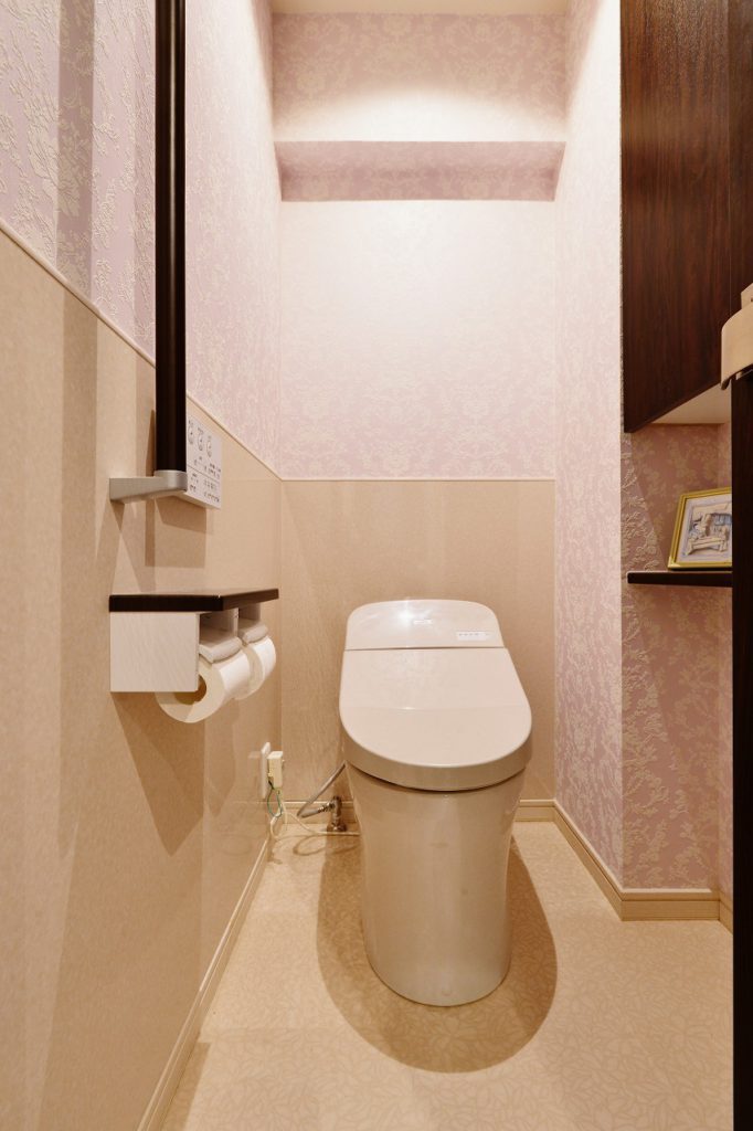壁紙を上下で分けることによって、天井を高く見せ、圧迫感のないトイレを作ることができます。