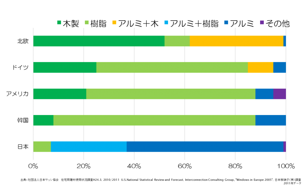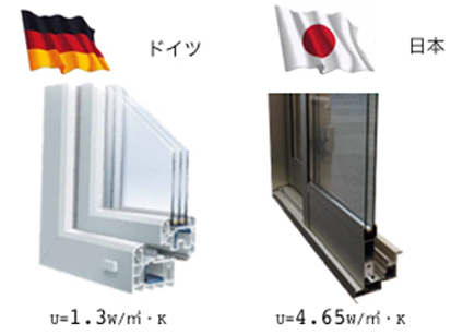 右の写真は、日本で一般的に使用されているサッシとドイツの一般的なサッシの断面です。欧州ではトリプルガラスのサッシが一般的です。断面写真を見るだけで、性能の違いは一目瞭然です。日本のものづくりは進んでいるはずなのですが、残念ながらなぜか窓については、日本のマーケットにおいては先進国の中で最も低い性能のものが主流を占めてしまっています。