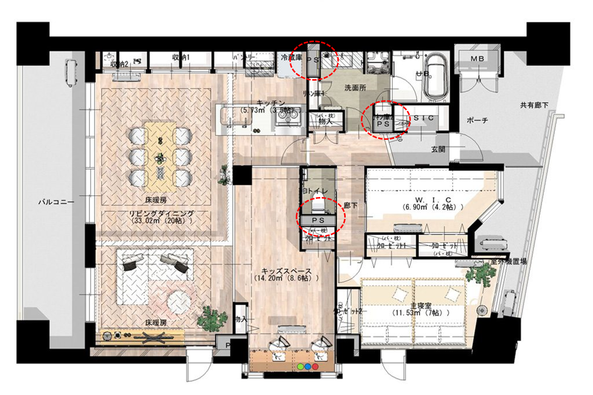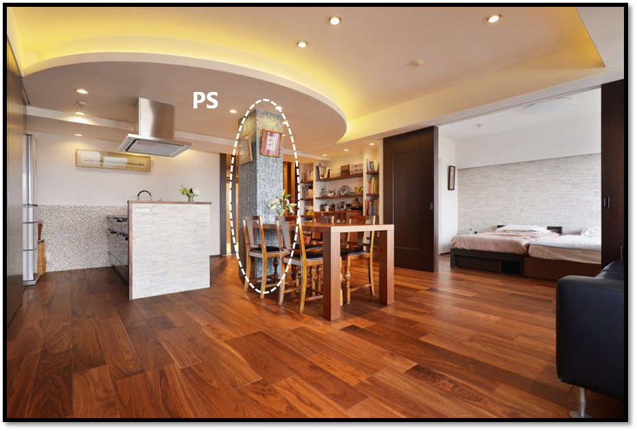 また、梁と柱以外にPS(パイプシャフト)にも要注意です。