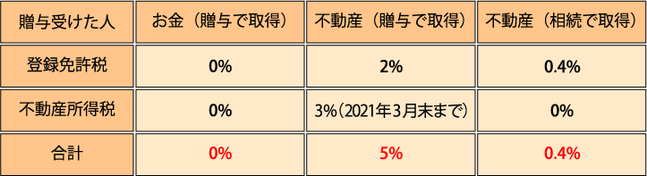 上記の表でお分かりかと思いますが、不動産で贈与を受けると贈与税以外に上記の税金が5%も毎年不動産を動かすたびに課税されます。