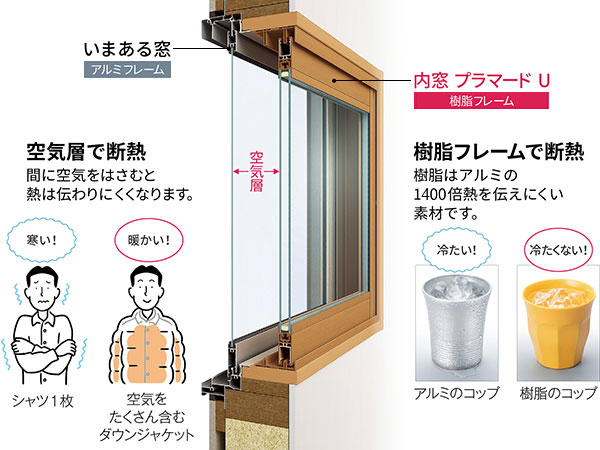 内窓を付けると外窓と内窓の間に空気層ができます。魔法瓶の構造のように、間に空気をはさむと熱は伝わりににくくなるという作りです。