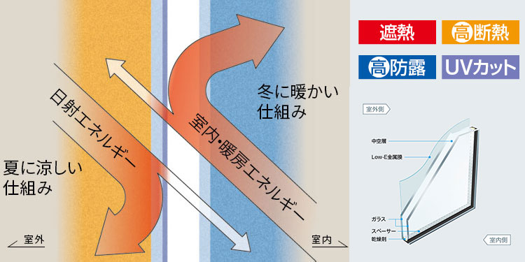 費用を抑えてできる最小限の対策方法は「ガラス交換」です。ガラス1枚で外と室内を隔てている状態で複層ガラス(ペアガラス)へ交換することでも多少暑さを抑えることができます。ポイントは、ガラスの種類をLow-Eガラスという日差しをカットしてくれる金属膜仕様のガラスを選ぶことです。