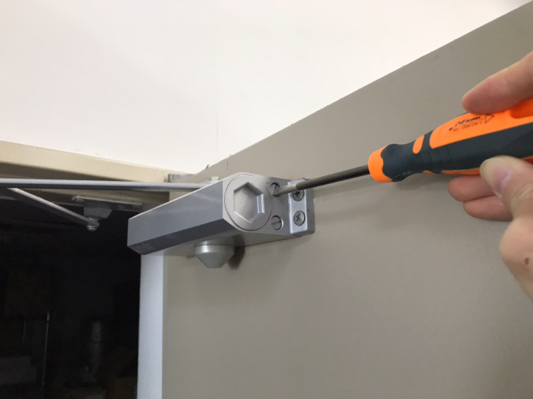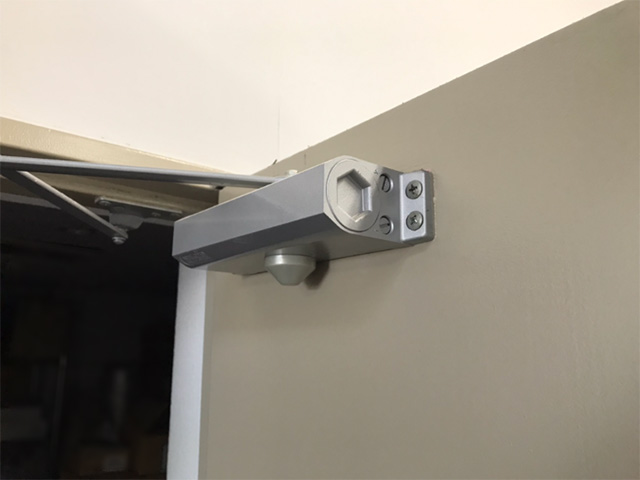 「ドアクローザー」といいますが、これを調整することでドアの閉まるスピードが調整できます。