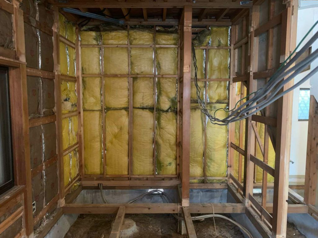 既存住宅の壁・床をはがして断熱・外装を施工します。