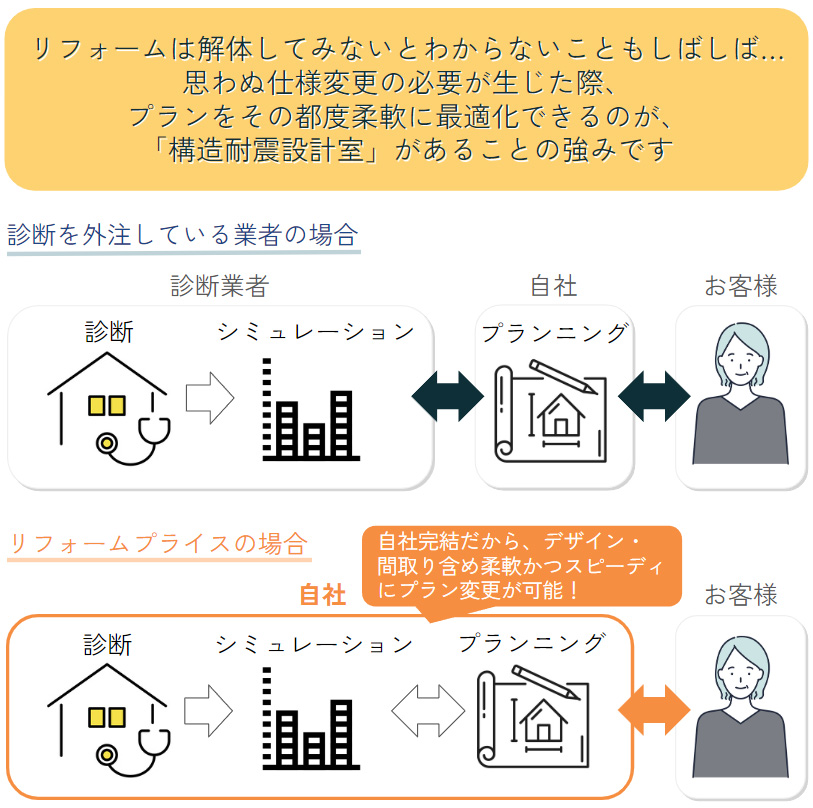 リフォームプライスでは、社内に耐震・断熱設計の専門部署【構造耐震設計室】を置いています。